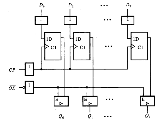例如,下面是由8个触发器组成的8位寄存器的电路图,D0-D7是8位数据输入端,在CP脉冲上升沿作用下,D0-D7端的数据同时存入相应的触发器。输出是Q0-Q7。