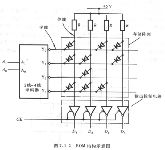 每个位置如果有一个二极管,说明该处有值1,否则说明该处存储的值是0.由此可见ROM电路是组合电路,并不是时序电路。