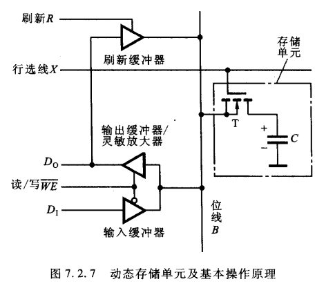 其工作原理是,电容的电荷存储效应,当电容C充有电荷时,呈现高电压,存储1,反之存储0.MOS管相当于一个开关,当行选择线高电平时,T导通,C与位线连通,反之则断开。由于电容电荷会消散,所以要有定时刷新电路来补充电荷。