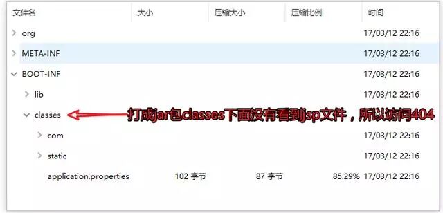 从上面可以看出来,jar包运行的时候会404错误,因为默认jsp不会被拷贝进来,而war包里面有包含了jsp,所以没问题。