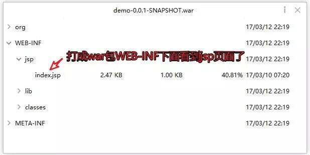 虽然网上有介绍说通过pom.xml配置,把WEB-INF目录复制到META-INF/resources下面。但是博主试了一整天还是访问不了,最后放弃了。各位如何有兴趣可以继续尝试,毕竟war也可以通过java -jar命令来启动的不是么。
