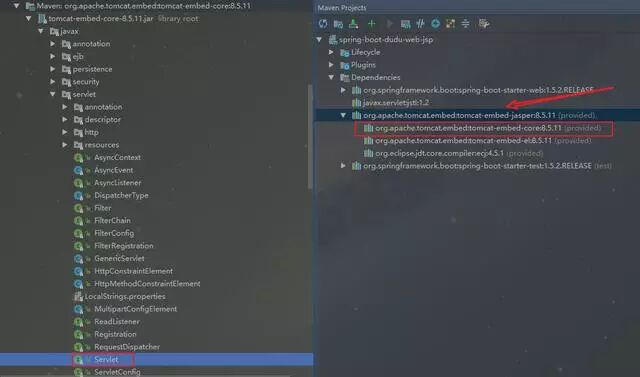 因为SpringBootServletInitializer需要依赖 javax.servlet,而tomcat-embed-jasper下面的tomcat-embed-core中就有这个javax.servlet,如果没用provided,最终打好的war里面会有servlet-api这个jar,这样就会跟tomcat本身的冲突了。这个关键点同样适应于下面说的第二种方法。