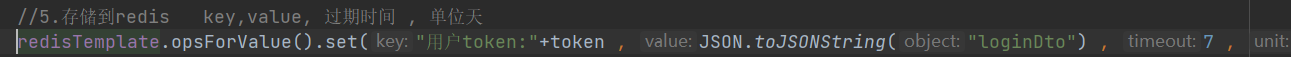 redisTemplate.opsForValue().set(RedisEnum.USERTOKEN.getRedisID()+ token, JSON.toJSONString(datebeasSysuser), 7, TimeUnit.DAYS);