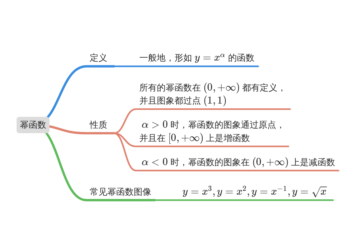 特别地,当\(α>1\)时,幂函数变化快,图象下凹;当\(0<α<1\)时,幂函数变化慢,图象上凸;