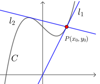 曲线\(C:y=f(x)\)在点\(P(x_0 ,y_0)\)处的切线指的是\(P\)为切点的切线,如图一;