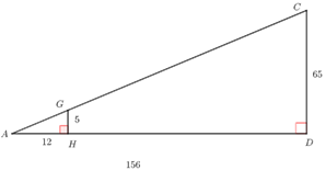 【小结】 考核几何综合,相似或三角函数;该题中貌似计算量很大,注意到\(65\)与\(156\)的最大公约数是\(13\),其实\(AC\)很好求,把\(∆ACD\)缩小\(13\)倍,得到\(∆AGH\),可得\(AG=13\),则\(AC=13×13=169\).