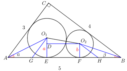 【解答】 设圆\(O_1\)与圆\(O_2\)的半经为\(a\)和\(b\),\(∠O_1 AB=α\),\(∠O_2 BA=β\),取\(AG=GO_1\),\(BH=HO_2\),作出下图,