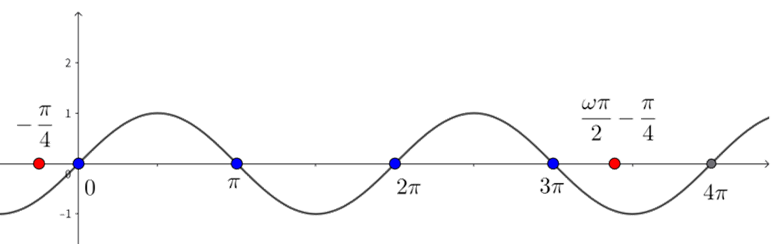 则存在\(k_0\in Z\),使得\(\left(\dfrac{π}{2}ω+\dfrac{π}{4},\dfrac{3π}{4}ω+\dfrac{π}{4}\right)⊆ \left[-\dfrac{π}{2}+2k_0π,\dfrac{π}{2}+2k_0π \right]\),