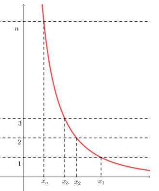 结合第一问的方法2可把\(x_n\)理解为\(g(x)=\dfrac{e ^{1-x}}{x}\)与\(y=n\)的交点横坐标,