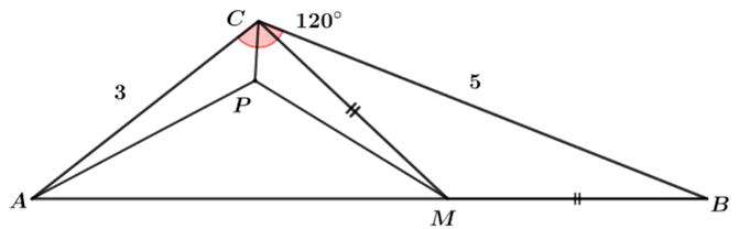 (3) 已知在\(△ABC\)中,\(C= \dfrac{2\pi }{3}\),\(AC=3\),\(BC=5\),点\(M\)在线段\(AB\)上,且满足\(CM=BM\),若点\(P\)为\(△AMC\)的费马点,求\((\overrightarrow{PA}+\overrightarrow{PC}) \cdot\overrightarrow{PM}+\overrightarrow{PA} \cdot\overrightarrow{PC}\)的值.