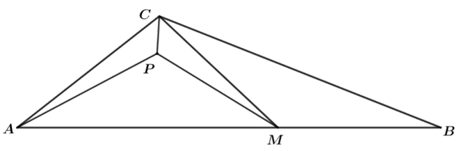 \(=\dfrac{1}{2} (|\overrightarrow{PA}||\overrightarrow{PC}|+|\overrightarrow{PA}||\overrightarrow{PM}|+|\overrightarrow{PM}||\overrightarrow{PC}|)\sin \dfrac{2\pi }{3}\)\(=\dfrac{\sqrt{3}}{4}(|\overrightarrow{PA}||\overrightarrow{PC}|+|\overrightarrow{PA}||\overrightarrow{PM}|+|\overrightarrow{PM}||\overrightarrow{PC}|)=\dfrac{30\sqrt{3}}{13}\),