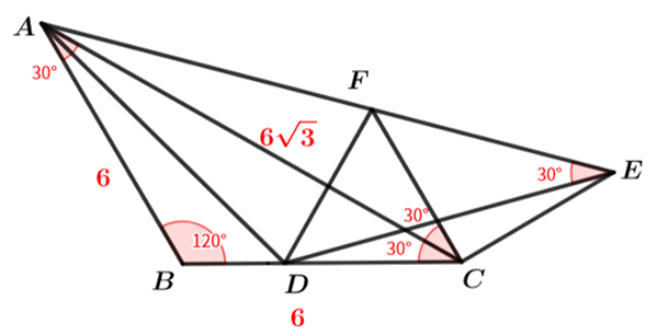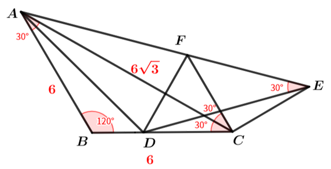 \(∵AB=BC=6\),\(∠ABC=120^\circ\),\(∴AC=6\sqrt{3}\),