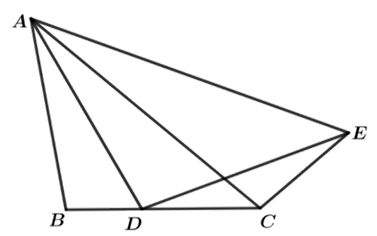 \(∴∠BAC=∠DAE=45^\circ\),\(\dfrac{AC}{AB}=\dfrac{AE}{AD}=\sqrt{2}\),