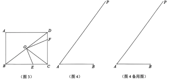 (3)如图3,在矩形\(ABCD中(AD>AB)\),其中心距比\(λ=\dfrac{4}{3}\),\(O\)为对角线\(BD\)中点,\(E\)是\(BC\)边上一点,连接\(OE\),作\(OF⊥OE\)交\(CD\)边于点\(F\),若\(BD=10\),\(S_{∆COF}=2S_{∆COE}\),求\(CE\)的值;
