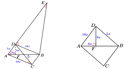 易得\(∆ACD~∆DEB\),则\(\dfrac{AD}{AC}=\dfrac{BD}{DE}⟹\dfrac{5x}{10x}=\dfrac{10x}{DE}⟹DE=20x\),