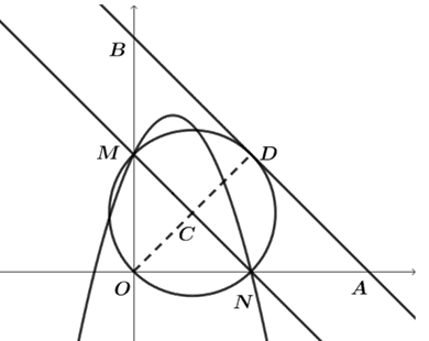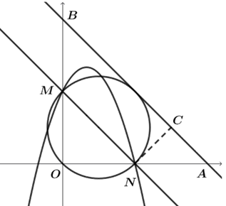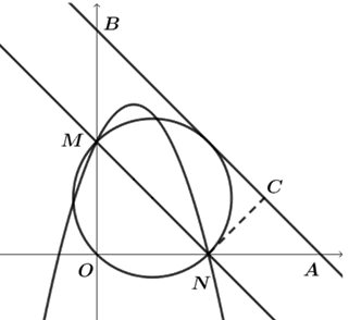 而\(CN=AN\cdot \sin45^\circ =\dfrac{\sqrt{2} }{2} (6-3)=\dfrac{3\sqrt{2} }{2}\),圆的半径为\(\dfrac{1}{2} MN=\dfrac{1}{2} \sqrt{OM^2+ON^2}=\dfrac{3\sqrt{2} }{2}\),