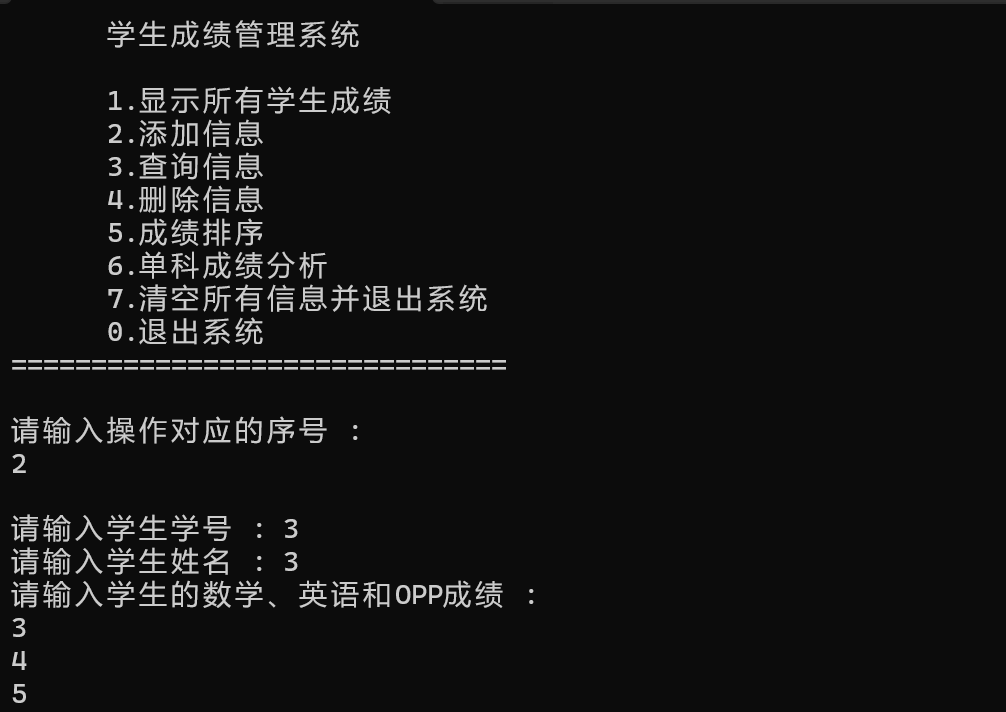 对于改善之后的程序的调试 1.显示学生成绩 2.添加信息 3.查询信息 4.删除信息 5.排序成绩 6.单科分析 7.清空 8.退出