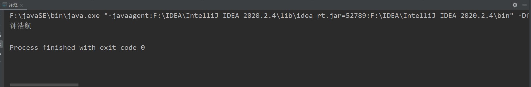 1 public class 注释 { 2 public static void main(String[] args) { 3 String student = "钟浩航";//定义变量 4 5 System.out.println(student); 6 } 7 }