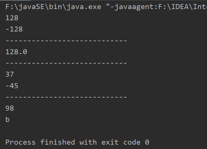 1 public class demo5 { 2 public static void main(String[] args) { 3 int i = 128; 4 byte b =(byte)i;//内存溢出 5 6 //强制转换 (类型)变量名 高----低 7 //自动转换 低----高 8 9 System.out.println(i);//128 10 System.out.println(b);//-128 11 System.out.println("----------------------------"); 12 13 double c = i; 14 System.out.println(c);//128.0 自动转换示例 15 System.out.println("----------------------------"); 16 /* 17 注意点 18 1.不能对布尔值进行转换 19 2.不能把对象类型转换成不相干的类型 (比如,不能把人转换成猪,但是男人女人间相干,男女之间可以转换) 20 3.把高容量转换至低容量的时候,强制转换。 21 4.转换的时候可能存在内存溢出,或者精度问题! 22 23 */ 24 25 //例如 26 System.out.println((int)37.7);//高----低 强制转换 37 27 System.out.println((int)-45.6f);//-45 28 System.out.println("----------------------------"); 29 30 //例2 31 char C = 'a'; 32 int d = C + 1; 33 System.out.println(d);//98 34 System.out.println((char) d);//b 35 } 36 }