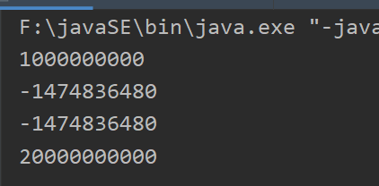 1 public class demo6 { 2 public static void main(String[] args) { 3 //操作比较大的数的时候,注意溢出问题! 4 //JDK7新特性,数字之间可以用下划线分割 5 int money = 10_0000_0000; 6 int years = 20; 7 int total = money*years; 8 long total2 = money*years;//默认是int计算,先计算后转换为long,在转换之前已经出现问题了 9 long total23 = money*(long)years;//先把一个数转换为long,再计算 10 11 System.out.println(money);//1000000000 12 System.out.println(total);//-1474836480(内存溢出!) 13 System.out.println(total2);//-1474836480(内存溢出!) 14 System.out.println(total23);//2000000000 输出成功 15 16 17 } 18 }