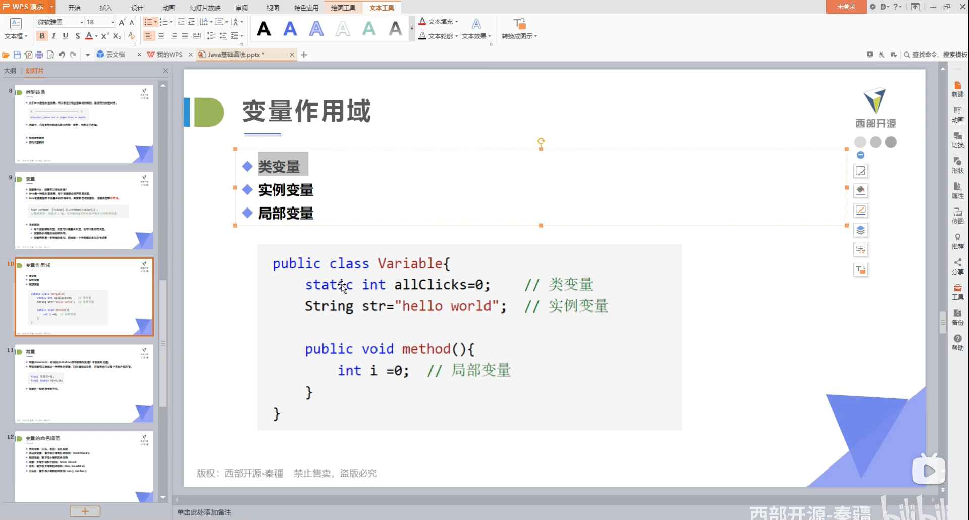 1 public class demo8 { 2 //属性:变量 3 4 //代码块 5 static { 6 7 } 8 9 //实例变量:在类里面,方法之外,从属于对象,如果不进行初始化,这个类型的默认值 0 0.0 U0000 10 //布尔值:默认是false 11 //除了基本类型,其余默认值都是null 12 13 //例 14 String name; 15 int age; 16 17 //类变量 static 18 static double salary = 2500; 19 20 //main方法(主程序方法) 21 public static void main(String[] args) { 22 23 //局部变量:使用前必须声明和初始化值(通俗讲,只在{}内有用) 24 int i=10; 25 System.out.println(i);//10 26 27 //变量类型 变量名字 = new demo8(); 28 demo8 demo8 = new demo8();//对象 29 30 //类变量 static 31 System.out.println(salary);//2500.0 32 33 System.out.println(demo8.age);//0 34 System.out.println(demo8.name);//null 35 36 } 37 38 //其他方法 39 public void add(){ 40 41 } 42 43 }