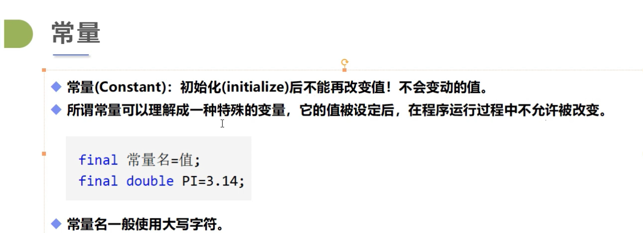 1 public class demo9 { 2 //修饰符,不存在先后顺序 3 static final double PI=3.14;//常量一般使用大写字母表示 4 //static 静态 5 //关键词:final代表常量 6 //final static double PI=3.14; 7 8 9 10 public static void main(String[] args) { 11 System.out.println(PI); 12 } 13 }