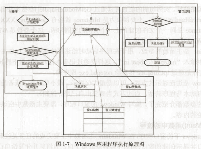 这是简化图,实际上Windows内部比这更复杂。现在主要关注“主程序”和“窗口过程”,二者间有“系统程序模块”。