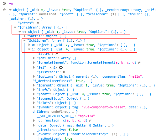 如图,Vue实例对象内部有 $children 属性,管理包含的 VueComponent;VueComponent 实例内部也有 $children 属性,管理包含的子组件。