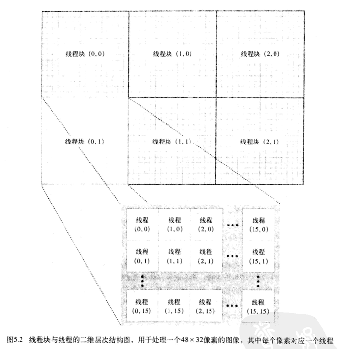 要深刻理解kernel,必须要对kernel的线程层次结构有一个清晰的认识。首先GPU上很多并行化的轻量级线程。kernel在device上执行时实际上是启动很多线程,一个kernel所启动的所有线程称为一个网格(grid),同一个网格上的线程共享相同的全局内存空间,grid是线程结构的第一层次,而网格又可以分为很多线程块(block),一个线程块里面包含很多线程,这是第二个层次。线程两层组织结构如下图所示,这是一个gird和block均为2-dim的线程组织。grid和block都是定义为dim3类型的变量,dim3可以看成是包含三个无符号整数(x,y,z)成员的结构体变量,在定义时,缺省值初始化为1。因此grid和block可以灵活地定义为1-dim,2-dim以及3-dim结构,对于图中结构(主要水平方向为x轴),定义的grid和block如下所示,kernel在调用时也必须通过执行配置<<<grid, block>>>来指定kernel所使用的线程数及结构。