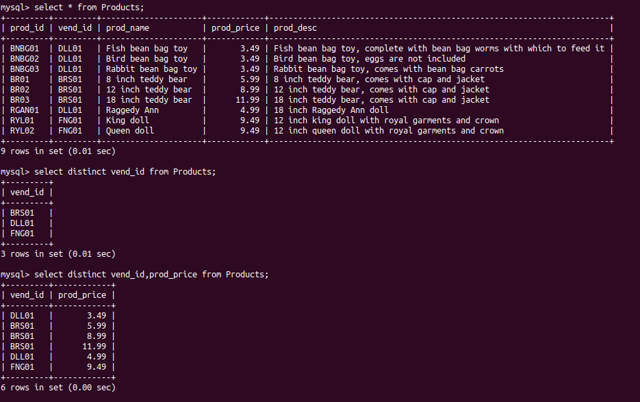 例如:你指定 select distinct vend_id,prod_price,因为指定的两列不完全相同,会根据最后一列进行去重