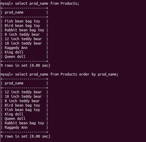 2、当 prod_price 相同是,才会按照 prod_name 进行排序。如果 prod_price 列中的所有值都是唯一的,不会按照 prod_name 排序