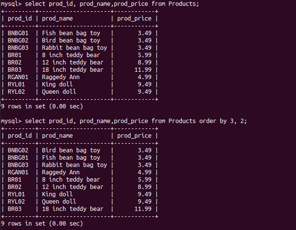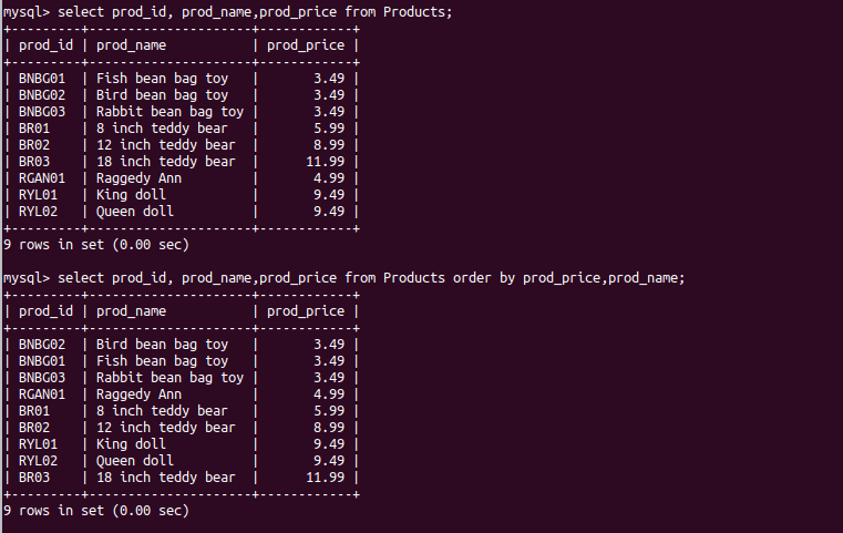 select prod_id, prod_name,prod_price from Products order by prod_price,prod_name;