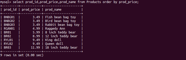select prod_id,prod_price,prod_name from Products order by prod_price ;