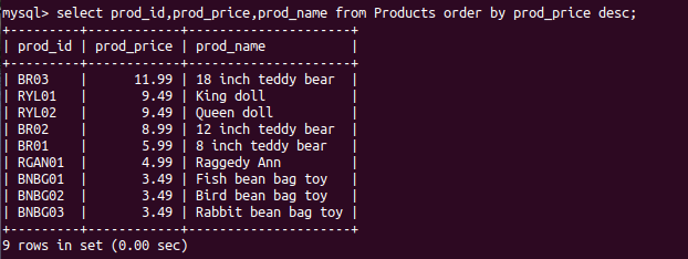 select prod_id,prod_price,prod_name from Products order by prod_price desc;