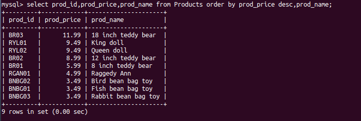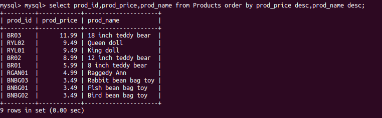 select prod_id,prod_price,prod_name from Products order by prod_price desc,prod_name;