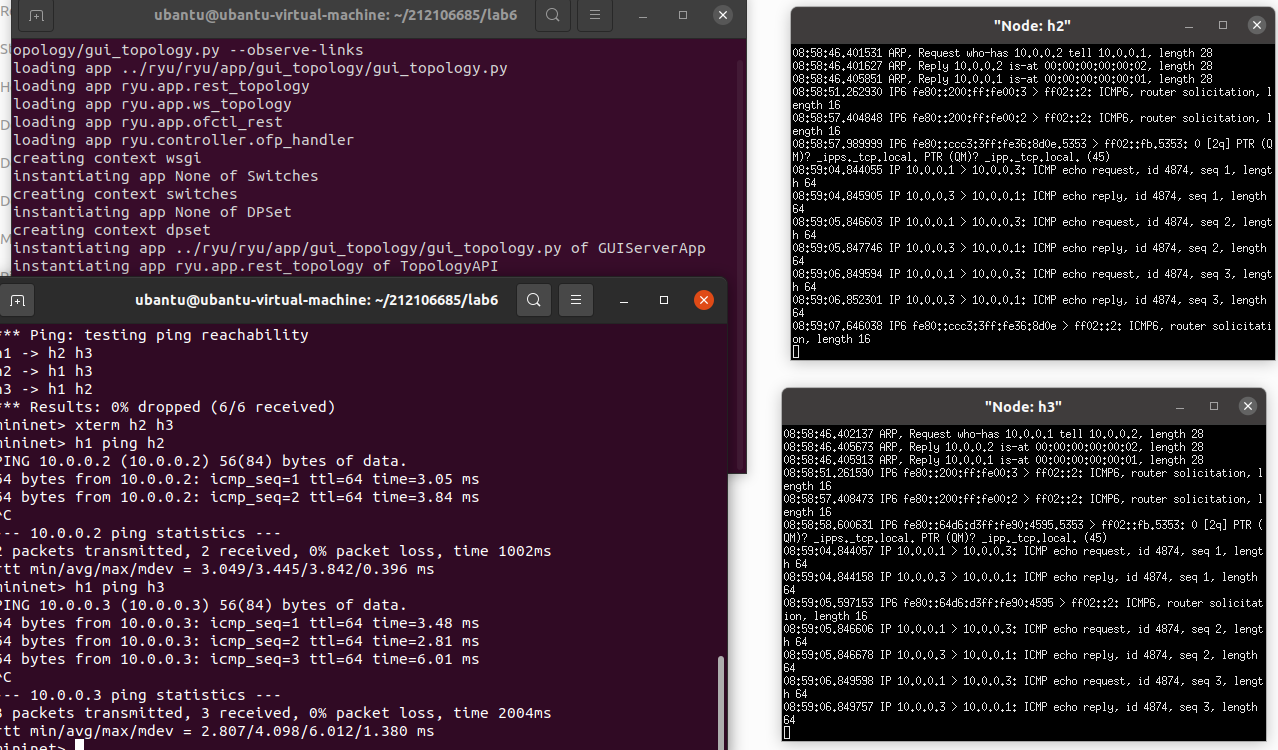 阅读Ryu文档的The First Application一节,运行当中的L2Switch,h1 ping h2或h3,在目标主机使用 tcpdump 验证L2Switch,分析L2Switch和POX的Hub模块有何不同。