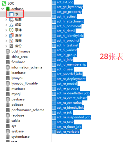 解压 activiti-6.0.0官方实例 ,根据自己安装的数据库版本选择相应的activiti6数据库创建sql。解压后,sql存放路径:\activiti-6.0.0\database\create。创建完成后,会有28张表,我使用的数据库名称为“actbase”。