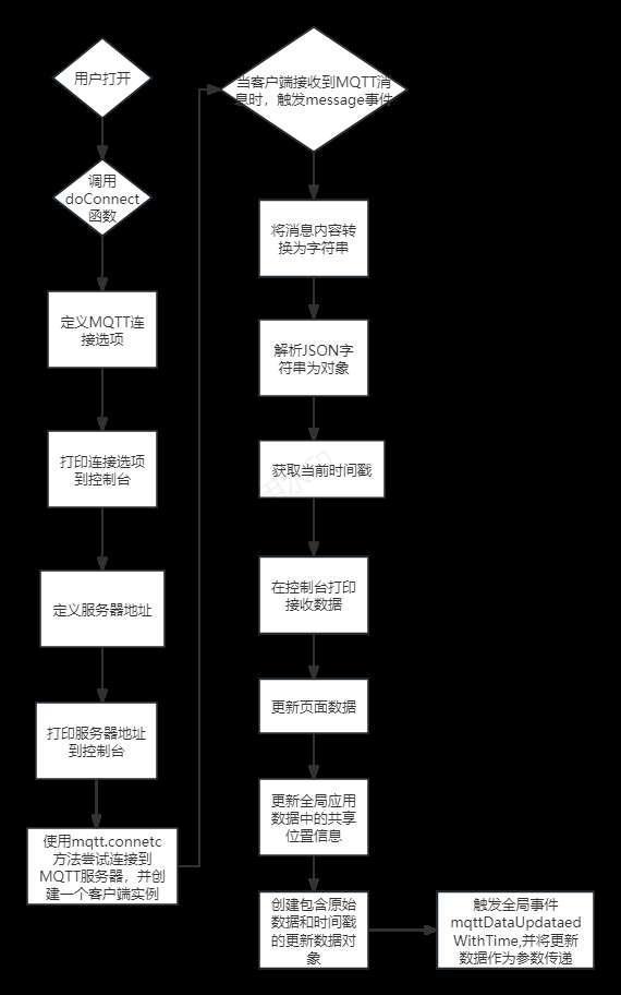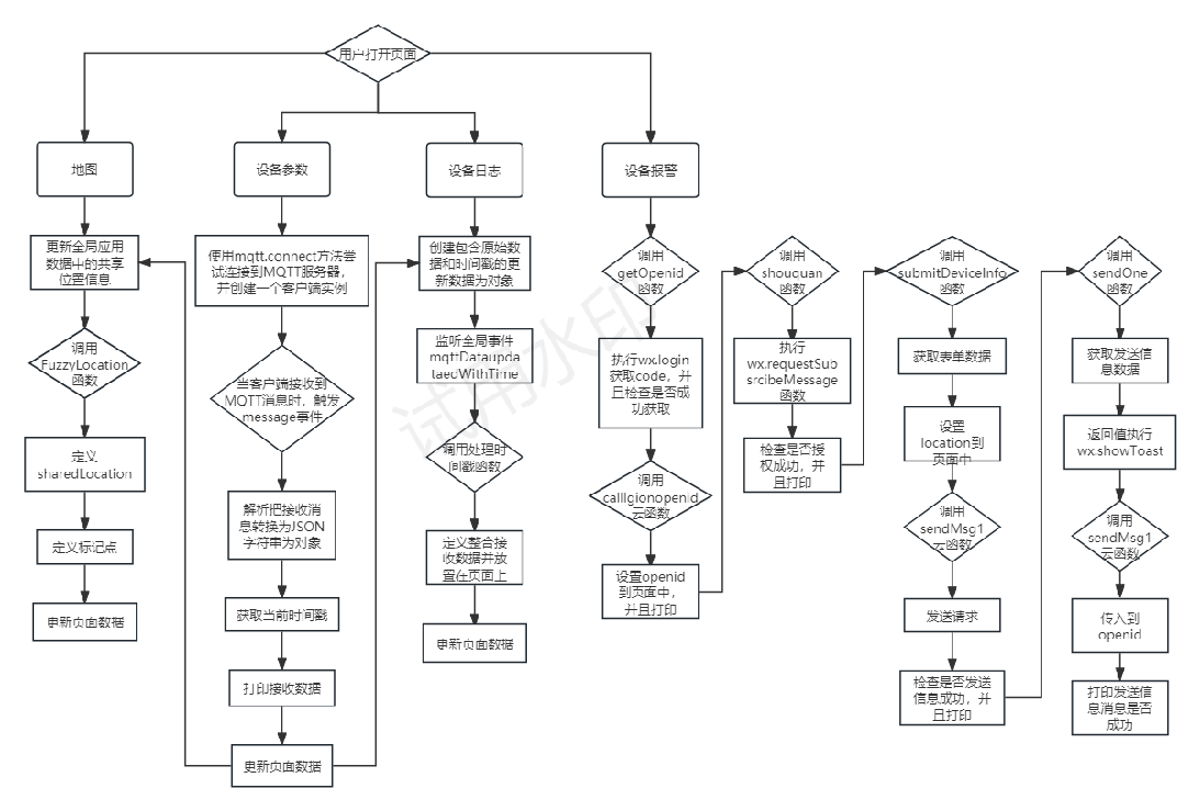 终端设备采用AIR780E模块作为主控器,电子模块有三轴加速度传感器、可燃气体传感器,AIR780E模块(4G模块)通过MQTT通信协议进行数据打包上传至EMQX服务器,在EMQX服务器中,用户可以自行订阅主题和发布主题,小程序通过MQTT通信协议订阅EMQX服务器的主题,服务器通过接收到硬件发布的数据,转发到微信小程序。