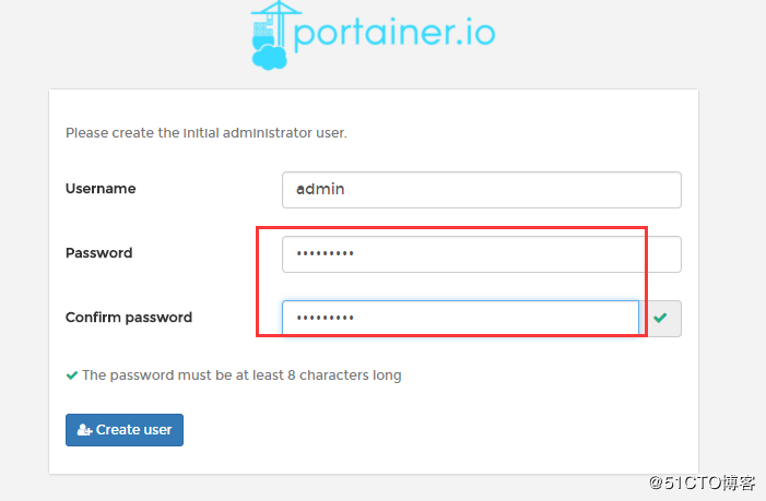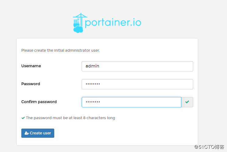 启动Portainer之后,首页还是给admin用户设置密码(这里和单机启动一样)。