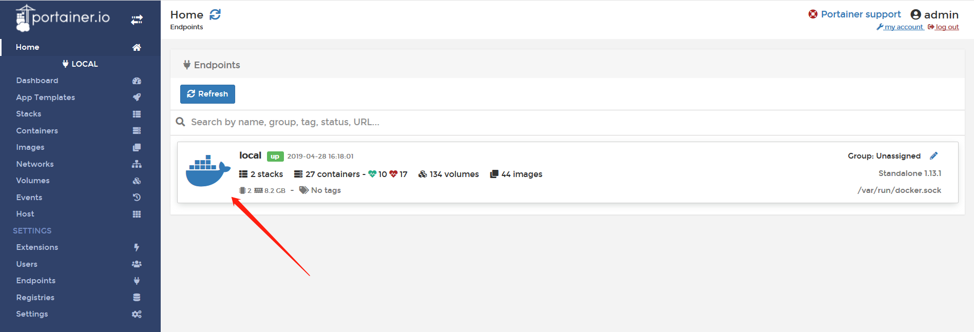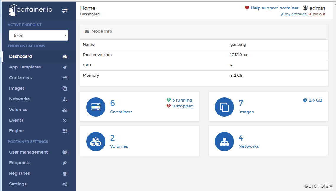 之后你进入到的是主界面,在这里你可以对容器、镜像、网络、数据卷等进行管理:
