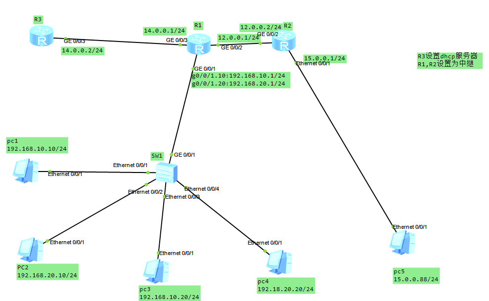 ###设置DHCP中继,服务器地址位14.0.0.2 [R1-GigabitEthernet0/0/1.10]int g0/0/1.20 [R1-GigabitEthernet0/0/1.20]ip add 192.168.20.1 24