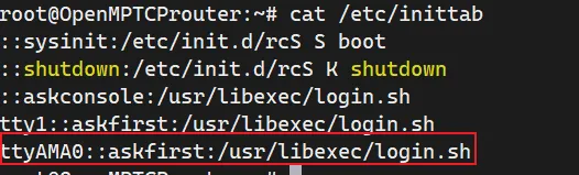 /etc/inittab,在文件末尾添加一行内容ttyAMA0::askfirst:/usr/libexec/login.sh