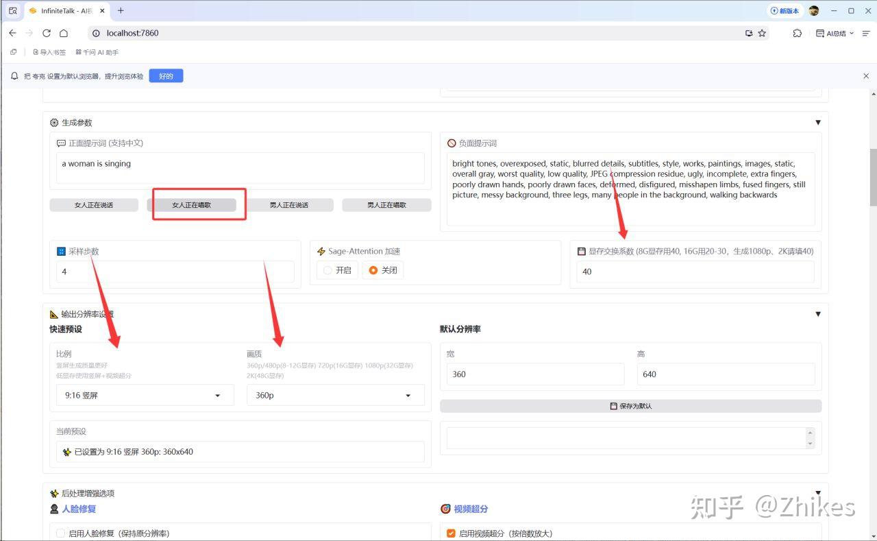 提示词选择女人在唱歌就行,显存交换系数按照提示填,比例和画质按照你的需求以及显卡显存选择即可。