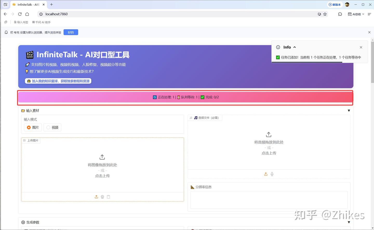 - 操作步骤:上传带麦克风的照片 → 上传歌曲音频 → 选择画质 → 开始生成。若想画面更真实,可只勾选“视频超分”,不勾选人脸修复。