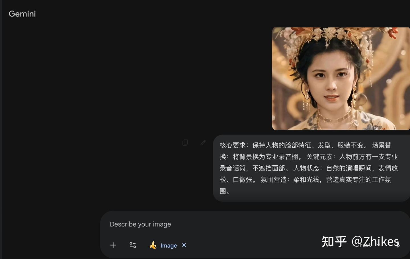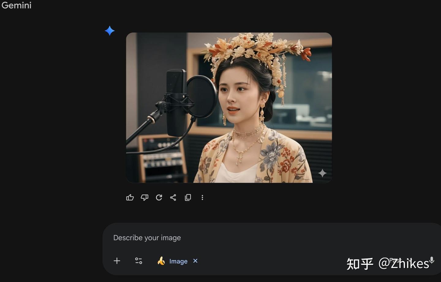 先用 AIGC 工具生成一张人物在麦克风前的照片,常用工具包括 Nano Banana(Gemini)、豆包、千问等。这里以 Nano Banana 为例https://gemini.google.com/app,推荐以下提示词: