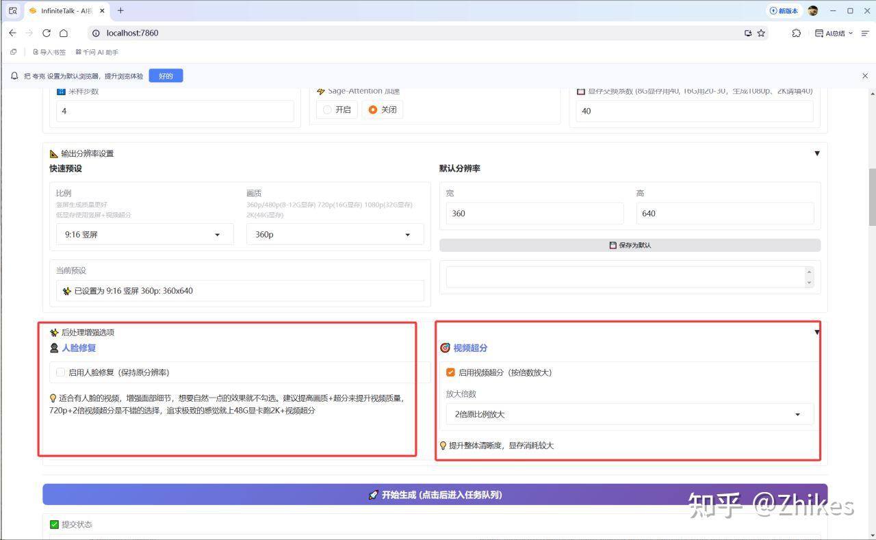 - 电脑显卡不太好的,选太高分辨率容易显存 OOM,可勾选“视频超分”提升画质,其实生成出来也差不多。