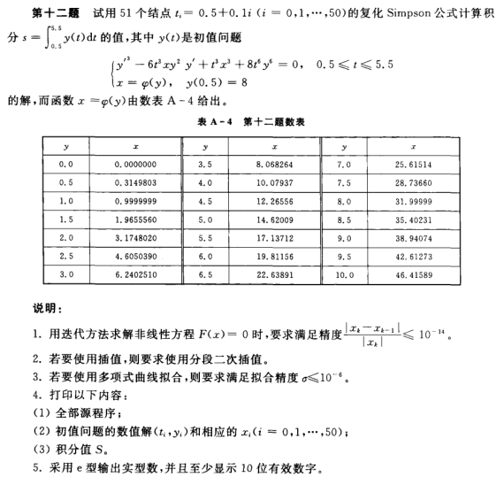 void qxnh(double c_final[100]) { double x[21][21]; double x_list[21] = { 0.000000,0.3149803,0.9999999,1.9655560,3.1748020,4.6050390,6.2402510, 8.068264,10.07937,12.26556,14.62009,17.13712,19.81156,22.63891, 25.61514,28.73660,31.99999,35.40231,38.94074,42.61273,46.41589 }; for (int i = 0;i < 21;i++) { x[i][0] = x_list[i]; } double y[21][21]; for (int i = 0;i < 21;i++) { y[i][0] = 0.5 * i; } //k次多项式进行拟合 x=φ(y) double A[21][21]; double AT[21][21]; double ATA[21][21]; double ATx[21][21]; double ATA_1[21][21]; double c[100]; double new_x[21]; double epsilon ; double new_ATx[21]; double c_mul[21][21]; for (int k = 0;k < 21;k++) { //int k = 5; for (int i = 0;i < 21;i++) { for (int j = 0;j < k;j++) { A[i][j] = pow(y[i][0], j); } } //求转置矩阵AT for (int i = 0;i < k;i++) { for (int j = 0;j < 21;j++) { AT[i][j] = A[j][i]; } } //矩阵相乘 ATA multi(AT, A, k-1, 20, k,ATA); //矩阵相乘 ATy multi(AT, x, k-1, 20, 1, ATx); //求解逆矩阵(ATA)-1 //inverse(ATA, k - 1, k - 1, ATA_1); //矩阵相乘 C=(ATA)-1ATy for (int i = 0;i < k;i++) { new_ATx[i] = ATx[i][0]; } //multi(ATA_1, ATx, k-1, 20, 0, c_mul); //解方程 equation_solver(ATA, new_ATx, c,k); //show(c, k, 1); double mid_y ; for (int i = 0;i < 21;i++) { mid_y = 0.0; for (int j = 0;j < k;j++) { mid_y += pow(y[i][0], j)*c[j]; } new_x[i] = mid_y; } epsilon = 0.0; for (int i = 0;i < 21;i++) { epsilon += pow(new_x[i] - x[i][0], 2); } std::cout << "epsilon " <<k<<": "<< epsilon << "\n"; if (epsilon <= 1e-6) { std::cout << "停止循环,此时k = " << k << ";多项式的阶数为:"<<k-1<<'\n'; NUM = k; for (int i = 0;i < k;i++) { c_final[i] = c[i]; } break; } } }