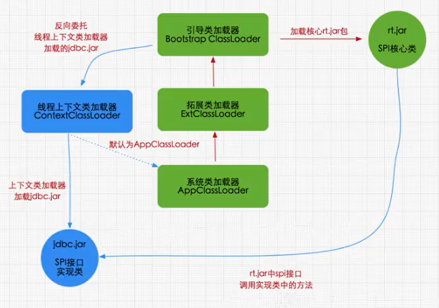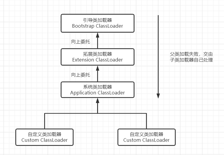 - 如果父类加载器还存在其父类加载器,则进一步向上委托,依次递归,请求最终将到达顶层的启动类加载器