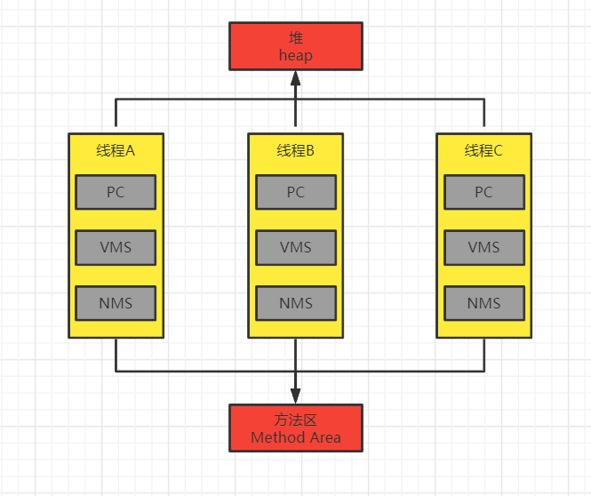 - 每个线程:有独立的程序计数器、栈、本地栈