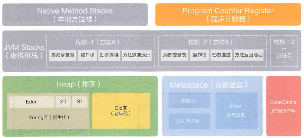 - 线程间共享:堆、堆外内存(永久代或元空间、代码缓存)